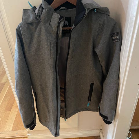 Skidjacka med massor av blixtlåsfickor på utsidan och även innerficka med blixtlås samt korthållare på vänster ärm. Färgen är gråbrun. Stl 170 och materialet är 90 Polyester och 10 Elastan.
