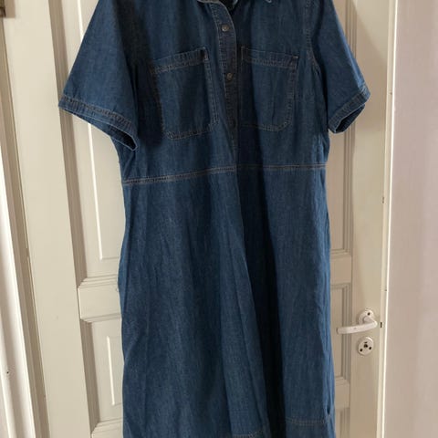 Svart jeansklänning med knappar framtill och ett matchande bälte.