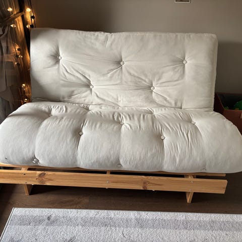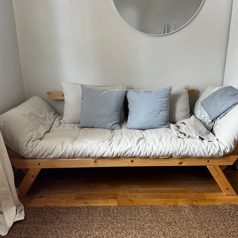 Karup Design bäddsoffa med läderremmar som armstöd. Bäddmått 130x190. Medföljer en i princip ny bäddmadrass.