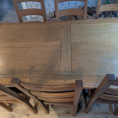 Det finns repor och färg på bordet så det behöver slipas och behandlas för att bli fint igen.