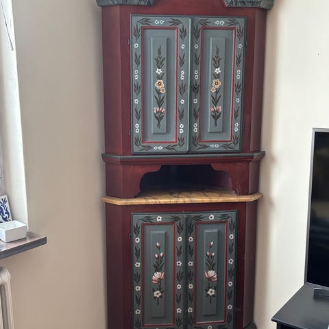 Antikt hörnskåp tillverkat i mahogny med en övre del som har glasdörr med dekorativa spröjsar . Skåpet har en nedre del med dörr och låsbar nyckel. Mörk mahogny med gustaviansk stil och detaljerad listverk. Passar för förvaring och som möbel i hörn.