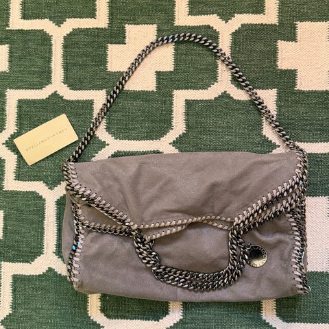 Stella McCartney väska i modell Falabella. Mått i CM: 18x6x17,5. Väldigt fint skick och sparsamt använd. Fodret har tecken på användning, men det är inget som syns om man inte vänder väskan ut och in som på bilderna. Kommer med sin original-dust bag. Nypris i butik är ca 9500 kr.