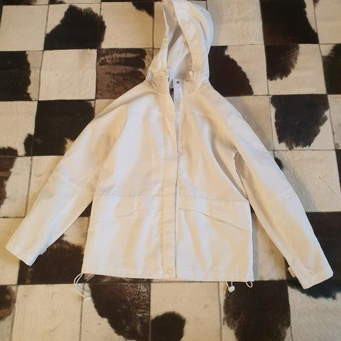 Beige vårjacka i linne med dragkedja och avtagbar huva från Massimo Dutti. Jackan har två fickor fram. OBS gul missfärgning vid den bruna lappen, syns bara på insidan (sista bilder). Annars perfekt skick.