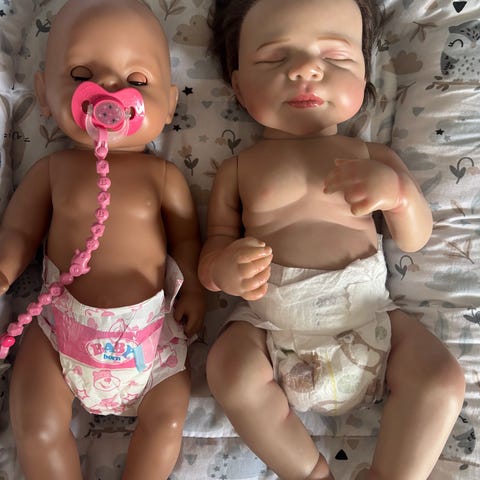 Baby Born häst med vagn och två minidockor. Hästen är brun med rosa sele och vagn. Dockorna är klädda i ridkläder, en i svart och rosa jacka med vita byxor och hjälm, den andra i ljuslila rock och svart hjälm. Setet är avsett för barn och kan användas för lek och rollspel. Är i mycket bra skick. Samt en bratzdocka med brunt hår (håret är i nuläget rufsigt o endel tovor, men går säkert kamma ur)
