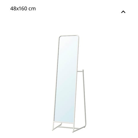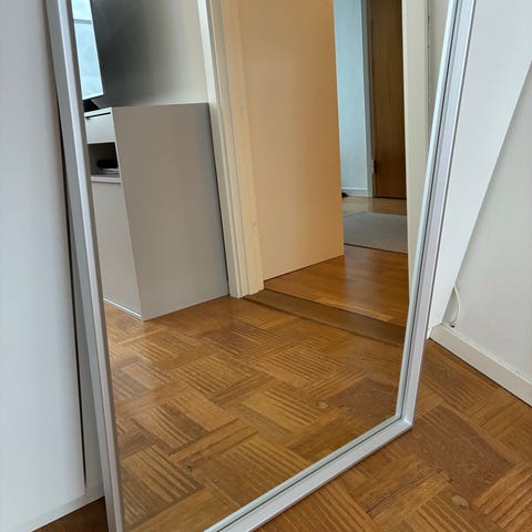 IKEA spegel med vit ram, utrustad med flera krokar för upphängning. Finns i Gröndal.