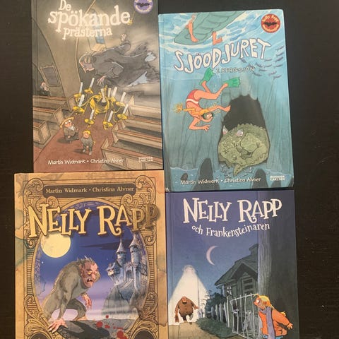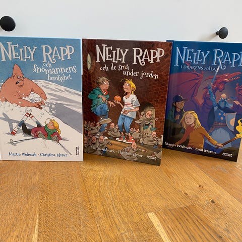 Dottern säljer nu 3 av sina böcker ur serien Nelly Rapp av Martin Widmark och Christina Alvner.