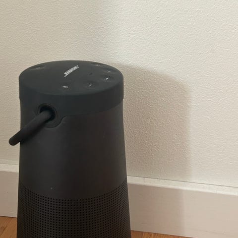 Bose högtalare med rektangulär design och kontrollpanel på ovansidan. Enheten har anslutningsportar på baksidan. Färgen är grön med en silverfärgad front.