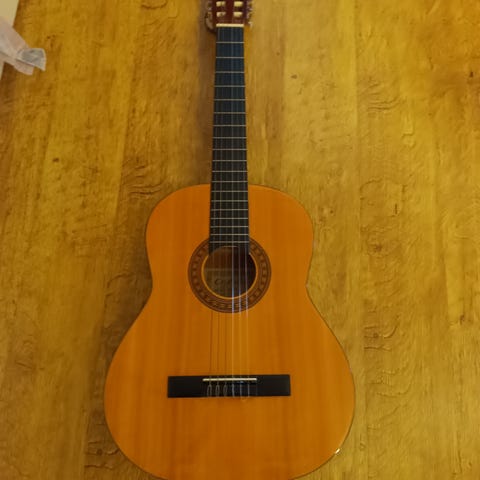 Vester akustisk gitarr i svart färg. Gitarren har tecken på användning genom repor och några märken men inget som påverkar funktionen.