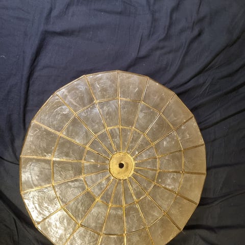 Snäckskalsplafond i med stomme i mässing. El fullt fungerande. Gott skick, några mindre brott på vissa snäckskal. 37 cm i diameter.