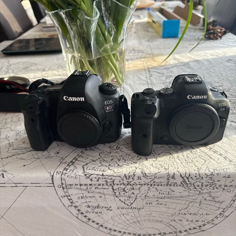 AI text from blocket: Canon EOS R6 systemkamera med vridbar skärm och elektronisk sökare. Kamerahuset är svart och designat för fotografering och videoinspelning.