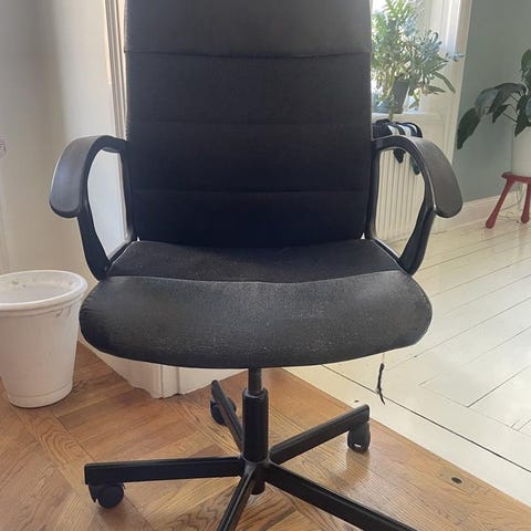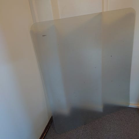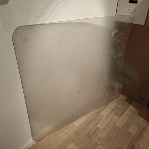 Perfekt skydd under skrivbordsstol för att skydda golv mot repor och slitage. Skyddet är fullt fungerande men har fläckar från tidigare användning, bl.a. några stänk av målarfärg. Fläckarna kan nog gå att ta bort med ordentlig rengöringsmedel.