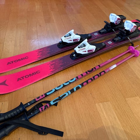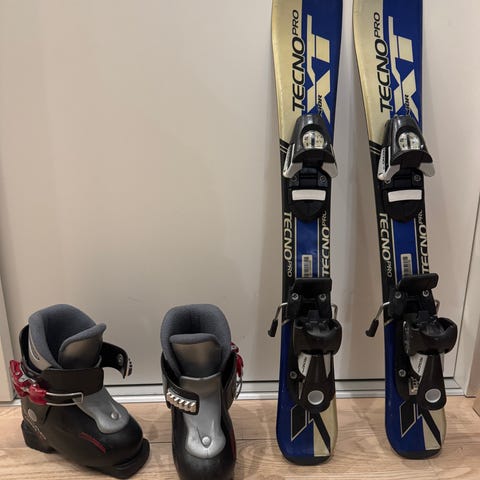 Slalomskidor Techno Pro 100 cm i ok skick. Slalompjäxor av märket Rossignol med innermått 22,5 cm och yttermått 26,5 cm i bra invändigt skick med märken i utvändig plast. Ryggskydd storlek xxs som passar barn i längden 128-140 cm.