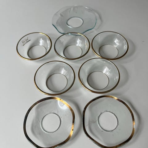 Ljushållare för värmeljus till ljusstake eller golvljusstake (se bild 2). Glas dekorerad med guldstjärnor, 5 stycken. Bra skick!