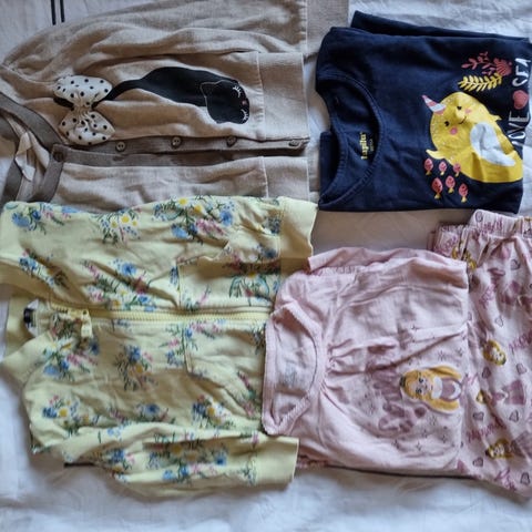 Två par byxor (Ett par joggingbyxor) och 3st tunna tröjor.