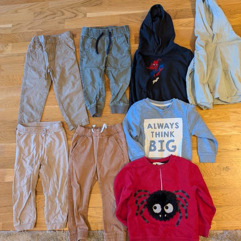 Klädpaket: 2st byxor + 3st tunna tröjor. Storlek 98/104.