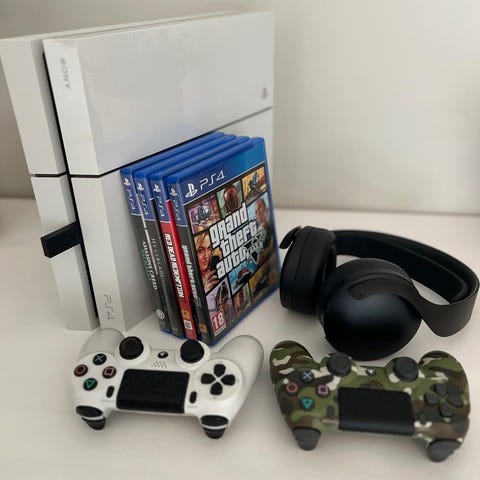 Sony Playstation 4 spelkonsol med fyra trådlösa handkontroller.
