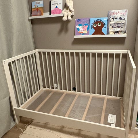 IKEA spjälsäng i vitt. Sängen har har ingen synligt skada för det är ej användes mycket .