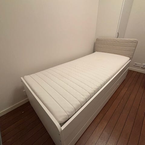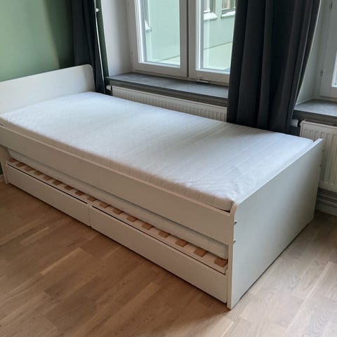 Säng modell SLÄKT med praktiska lådor och hyllor. Helt ok skick, några små skavanker här och där men fullt funktionsduglig. Vi har monterat ner den delvis för att den skall gå att transportera. 1000 kr eller högstbjudande.