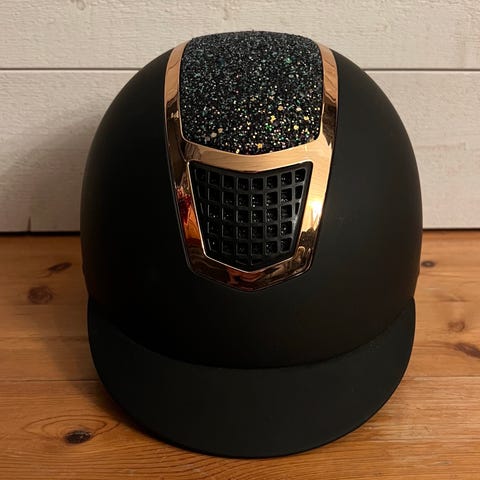 CRW ridhjälm med dekorativa detaljer i form av glittrande och nitar på ovansidan. Hjälmen är svart och har en justerbar rem för säker passform. Inuti finns vaddering för komfort och skydd under ridning.