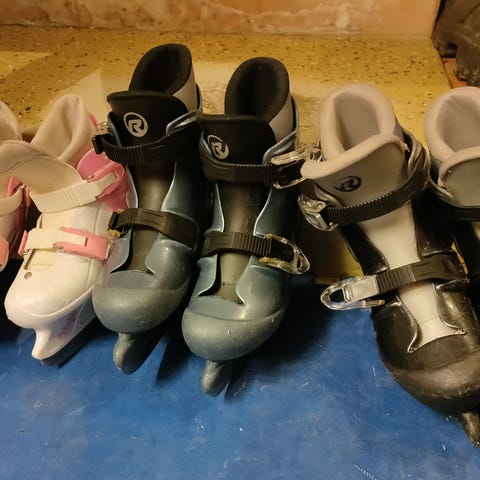 Raptor skridskor i barnstorlek 30. Skorna är utformade för barn och har justerbara spännen. Skon är grå med gröna detaljer.