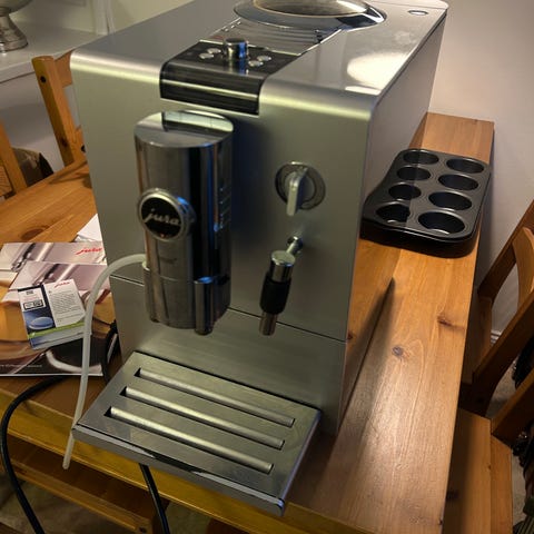 Jura Ena 3 espressomaskin i silver och svart färg. Maskinen har en mjölkskummare. Är helautomatisk, meddelar när den behöver rengöras. Den är avsedd för att brygga espresso och andra kaffedrycker. Maskinen har en användarvänlig kontrollpanel.