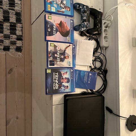 Playstation 4 spelkonsol med två handkontroller och nödvändiga kablar (ström, HDMI, laddning till båda kontrollerna). Använt i cirka 7 år men ändå i gott skick (enligt mig). En av handkontrollerna har grepptillbehör monterat.