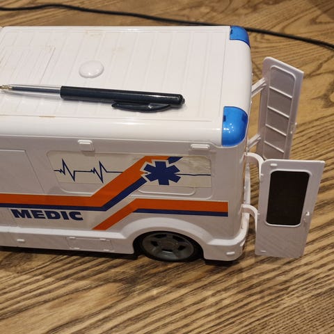 Vintage leksaksambulansbil i plåt, Ford-modell från 1960-talet.