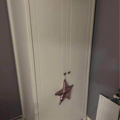 Garderob med två hyllplan och klädhängare. Använt skick men fullt funktionsduglig.