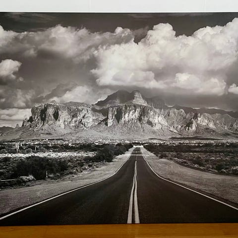 Svartvitt textiltavla som visar en rak landsväg med berg i bakgrunden. Bilden är inramad med en svart ram och kan användas som väggdekoration. Liten skada, inzoomad på bild 2.