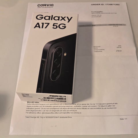 Samsung Galaxy A17 5G mobiltelefon med 128 GB lagringsutrymme. Telefonen tillkom på köpet i ett abonnemang, bevis på det finns. Helt oanvänd och obruten förpackning. Finns i Lund.