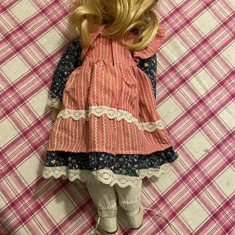 Charmig porslinsdocka med mörkt lockigt hår och uttrycksfulla ögon. Klädd i romantisk blommig klänning med spetsdetaljer och rosett. Mycket dekorativ och i fint skick – perfekt för samlare eller som mysig inredningsdetalj.