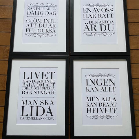 &Tradition dekorationstavlor med olika motiv inklusive text, läppar, skor och rosor. Tavlorna är av olika storlekar och passar för väggdekoration i hem eller kontor.