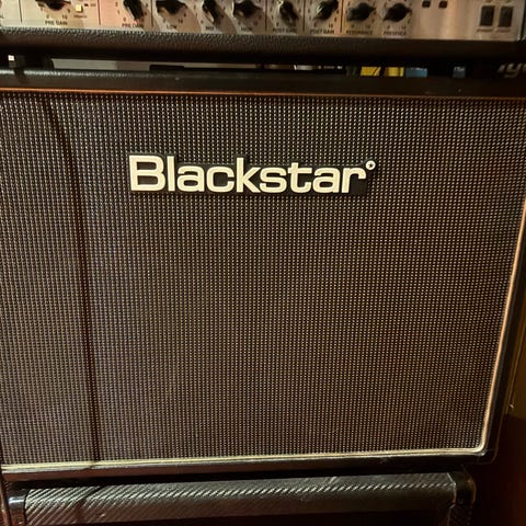 I svart färg med bärhandtag och anslutningspanel på baksidan. Produkten är avsedd för användning i första hand med gitarrutrustning.