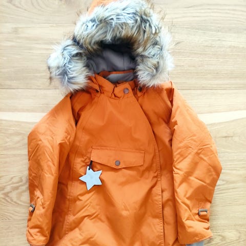 Vinterset med jacka och byxor. Jackan har tryckknappar och dragkedja framtill samt en avtagbar huva. Byxorna har justerbara hängslen och tryckknappar i sidorna.