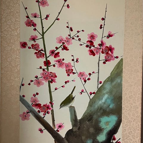 Fin målning som föreställer två fåglar, utförd med detaljerade penseldrag i grå, svart och beige toner. Målningen är signerad av konstnären Katarina W och är inramad med svart ram. Ramen är lite lös något trasig men själva målningen är mycket bra skick. Tavlan heter Tillsammans och jag har köpt den på auktion. Mått 75x60 cm