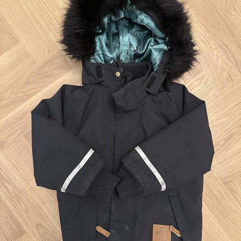 Polarn O. Pyret barnjacka i storlek 152, färg svart. Jackan är utformad för unisex och har en avtagbar huva med pälsimitation. Passar för barn och är lämplig för utomhusbruk under kyligare väder.