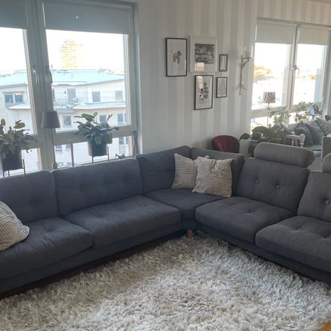 Hörnsoffa i grått tyg med maxiavslut Soffan har en modern design och är anpassad för hörnplacering.