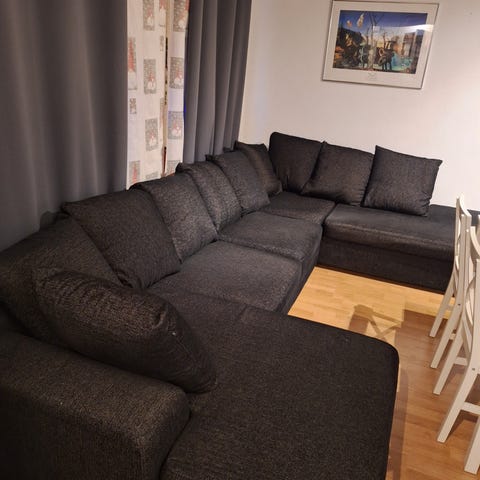MörkGrå hörnsoffa med maxiavslut