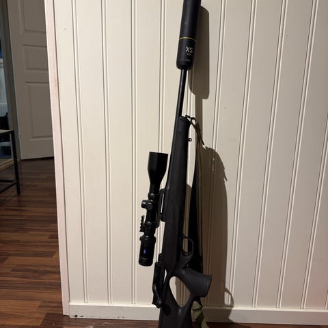 På bössan sitter det en ljuddämpare stalon w och ett kikarsikte zeiss 1.1-6x24. Säljs som ett paket men kan även säljas separate