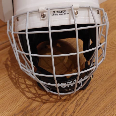 Jofa ishockeyhjälm i blå färg med skyddande metallgaller. Hjälmen är avsedd för ishockey och har storleken 50-57 cm.