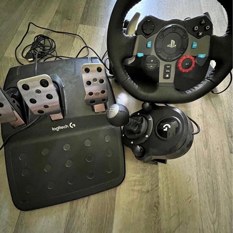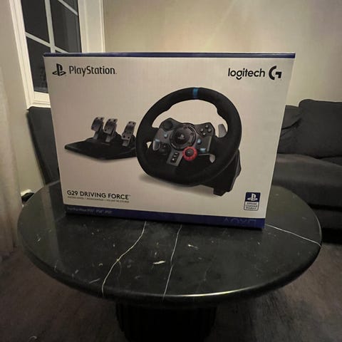 Logitech G29 racingrattmed tillhörande pedaler och växelspak. Utrustad med en USB-anslutning och strömadapter. Hjulen och pedalerna är designade för racing- och körsimulatorer och är kompatibla med PlayStation-system och pc.
