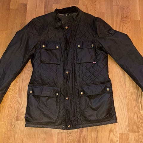 Belstaff jacka i storlek S för herrar. Jackan är mörkgrön och har en klassisk design med två jackfickor med knappar och dragkedja framtill. Insidan är fodrad med ett rutigt mönster. Material och ytterligare specifikationer finns på etiketten.