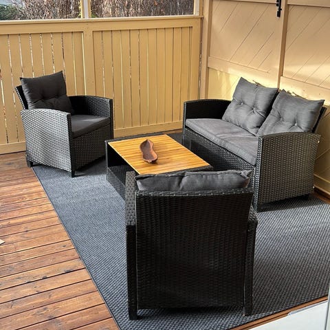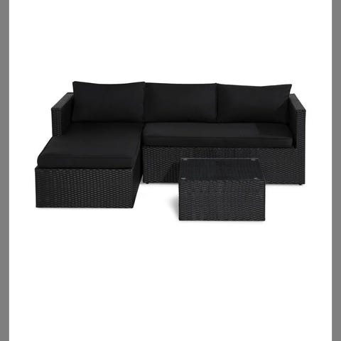 Utemöbelset bestående av en svart hörnsoffa med dynor, ett bord, samt två fåtöljer i svart konstrotting. Setet är lämpligt för utomhusbruk och erbjuder sittplatser för flera personer.