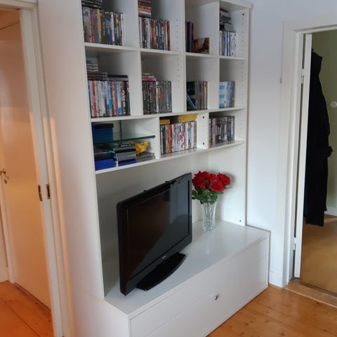 En modifierad ( satt på stödben ) TV-bänk från IKEA som nu gjort sitt. Snygg och lätt att montera då det sitter fästen för väggen så att den kan ”stå” på golvet istället för att hänga. Hämtas i Lödöse och TVn på bilden följer med om man önskar.