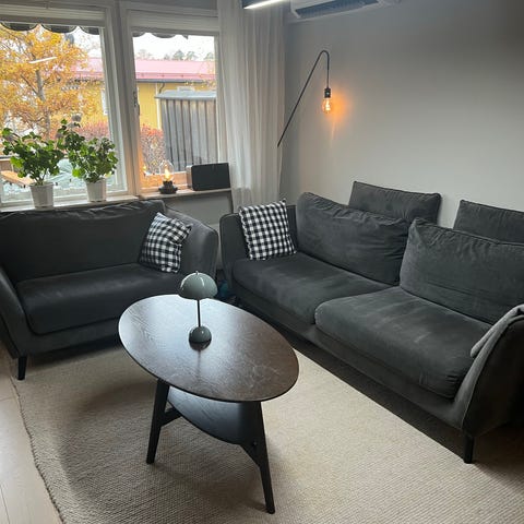 Köpt för ca 4 år sedan, med lite slitage från barn, djur och vanligt användande. Klädsel på dynor avtagbar.