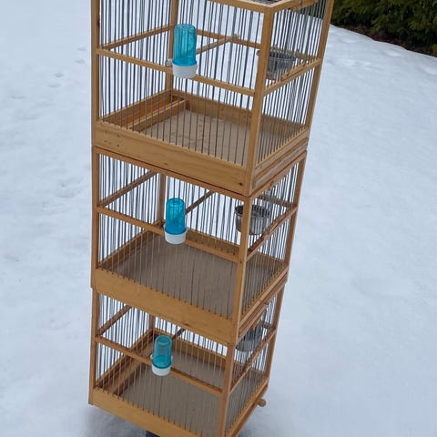 Bur i metall avsedd för fåglar. Burens konstruktion består av metallstänger och den har en rektangulär form. Passar för att hålla fåglar inomhus eller i skyddade miljöer.