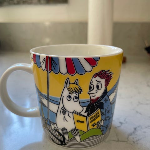 Andrahand, har inte använts av mig utan enbart stått i skåp sedan det kom i min ägo. Gott skick. Barnservis med muminmugg och fat som jag inte har något att anmärka på.