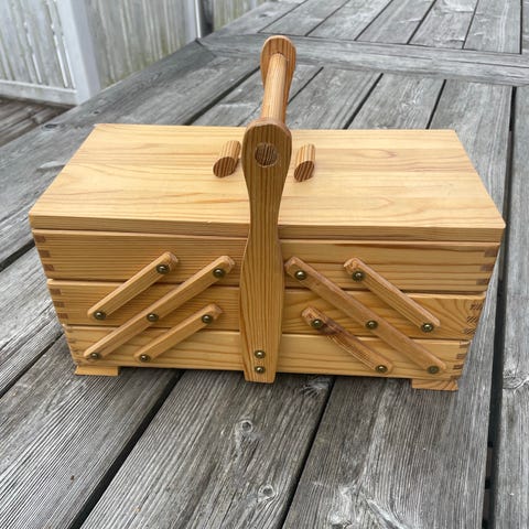 Hemslöjdad sy-tunna helt i trä. Dalablå med blom-motiv. Innrlåda under locket. Den är så fin. Märkt med "1954" på locket. Höjd är 40 cm. Ring mig på 072-9038336.