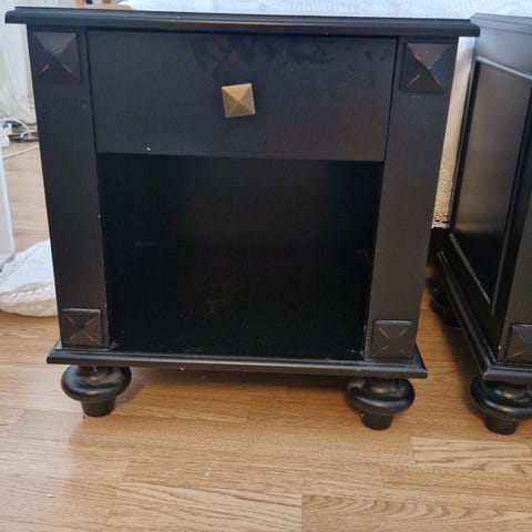 String nattduksbord med svart ben med låda och en hylla. Har fötterna kvar. Har ett märke på bordskivan vet ej om det går bort.