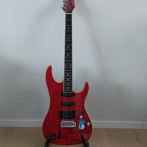 Gitarren är en Yamaha ERG 121. Den har rätt mycket dings och tryckmärken på kroppen. Nya strängar på och spelar helt okej! Skulle dock må bra av en justering. Halsmickens ena fjäder verkar bråka, så den sitter inte helt fast. Lätt att fixa men stör inte allt för mycket heller.